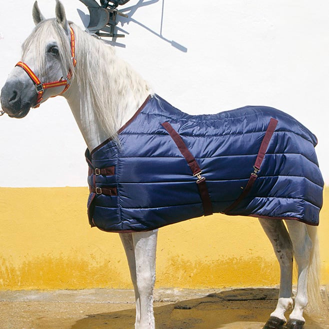 Manta de nylon acolchada impermeable premium, diseñada para mantener a tu caballo protegido y abrigado sin restringir su libertad de movimiento. Fabricada en nylon impermeable y transpirable, garantiza el bienestar del animal tanto en días de lluvia como durante el transporte. Incorpora doble cinchuelo cruzado para evitar que la manta se gire, doble cierre delantero y tope trasero para un ajuste firme y seguro. Gracias a su acolchado y versatilidad, es ideal tanto para el uso diario como para la protección durante viajes o condiciones meteorológicas adversas.